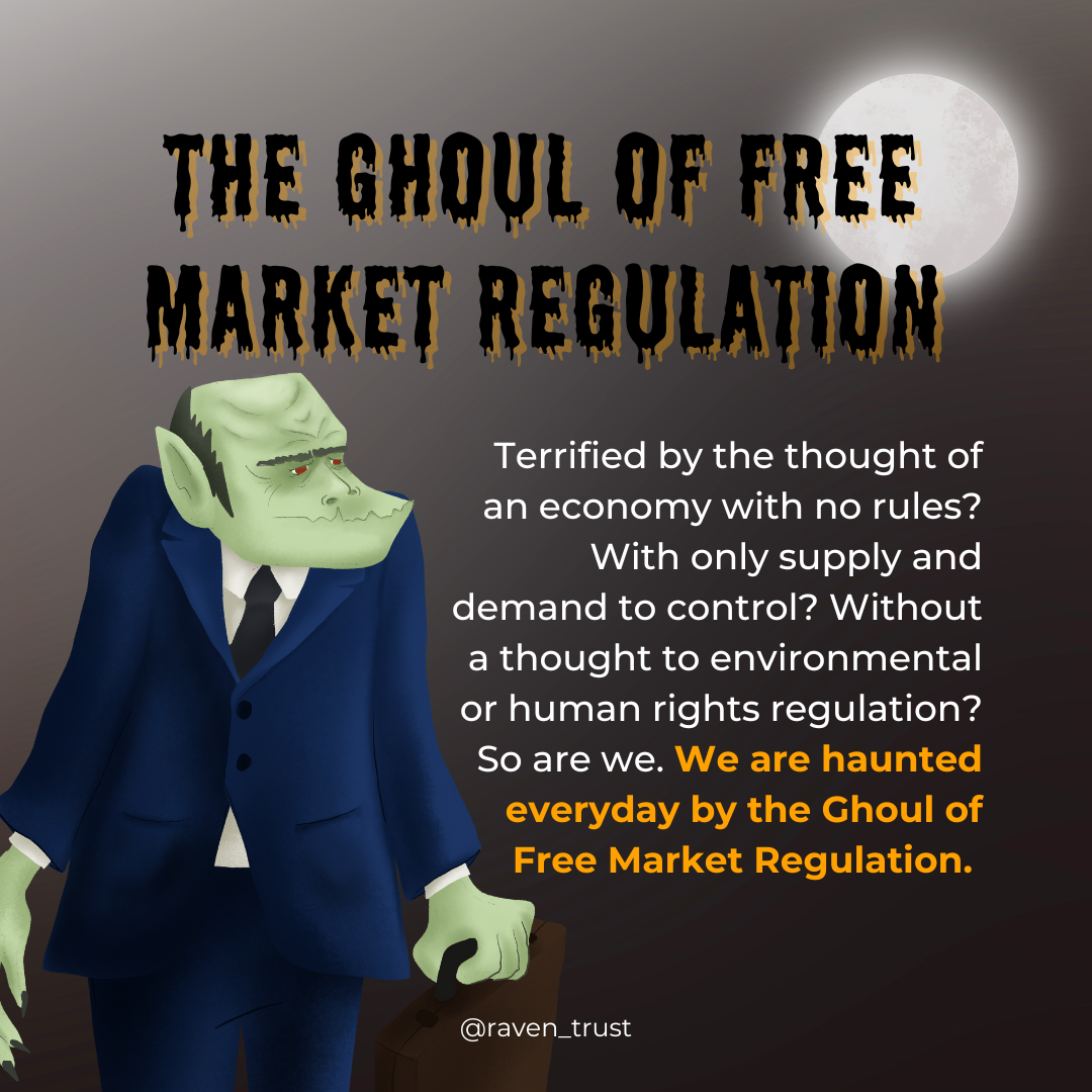 Terrified by the thought of an economy with no rules? With only supply and demand to control? Without a thought to environmental or human rights regulation? So are we. We are haunted every day by the Ghoul of Free Market Regulation.