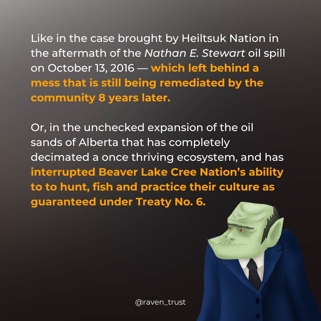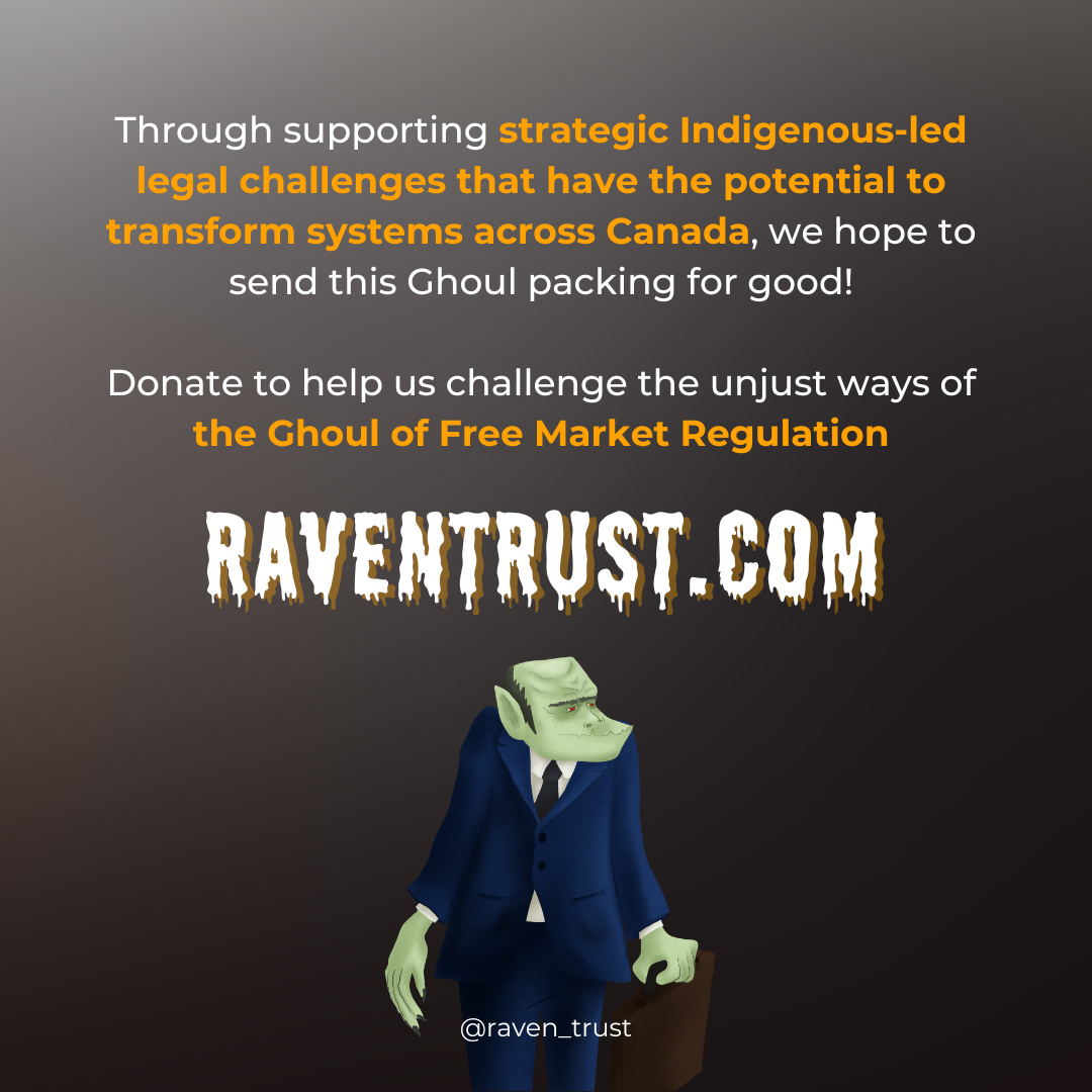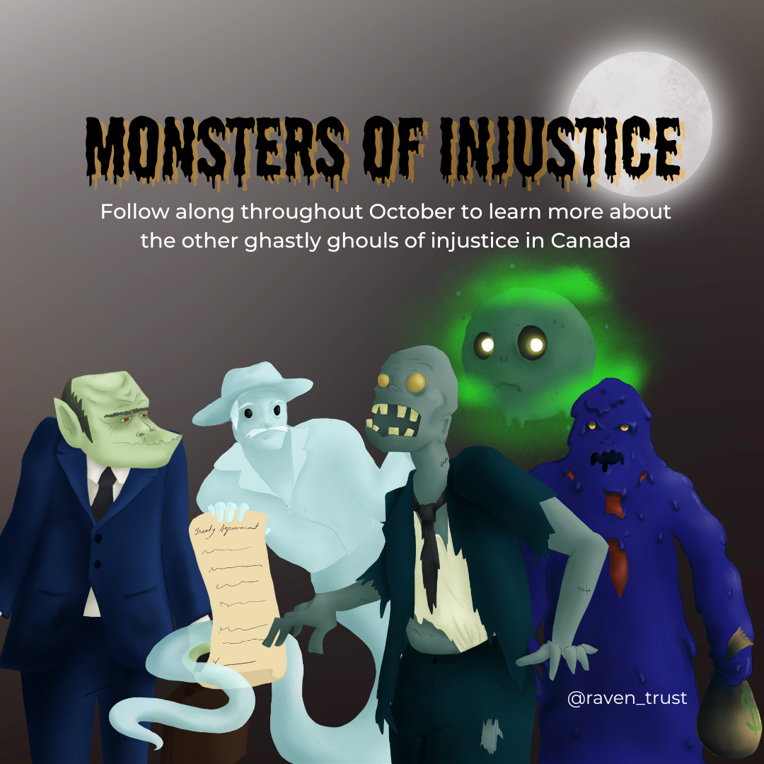 Keep an eye out for this ghoul throughout October and in the future. You’ll see his crepuscular face peeking out when we talk about the ways an economy that’s designed to favour a free market, where companies can act in their best interest as opposed to the collective wellbeing, wreak havoc on Indigenous territories and how Indigenous-led litigation is challenging his ghoulish ways in court.