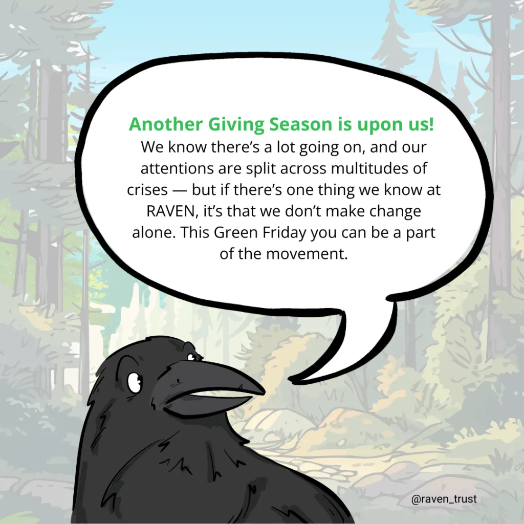 And, we’re not any different — we’ll be in your inboxes, and we’ll be sharing with you all the reasons we are continuing to grow the movement for Environmental justice and Indigenous sovereignty in Canada. But, we know that this time of year can be hard to give as an individual. So, we’re offering some alternatives to support RAVEN through your business or workplace.