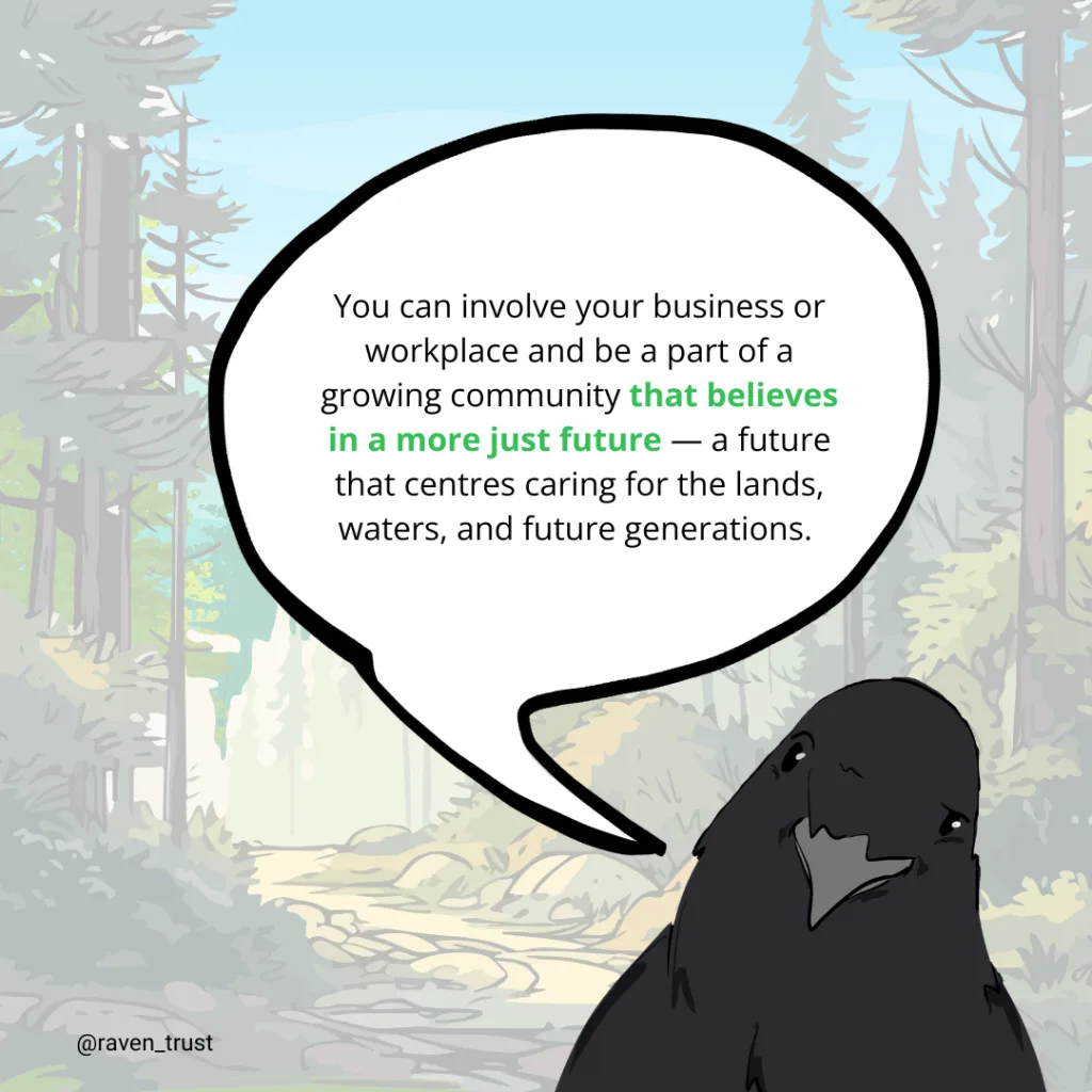 By aligning with RAVEN, your business or workplace can be a part of a growing community that believes in a future that is just, and a future that centres caring for the lands, waters, and future generations.