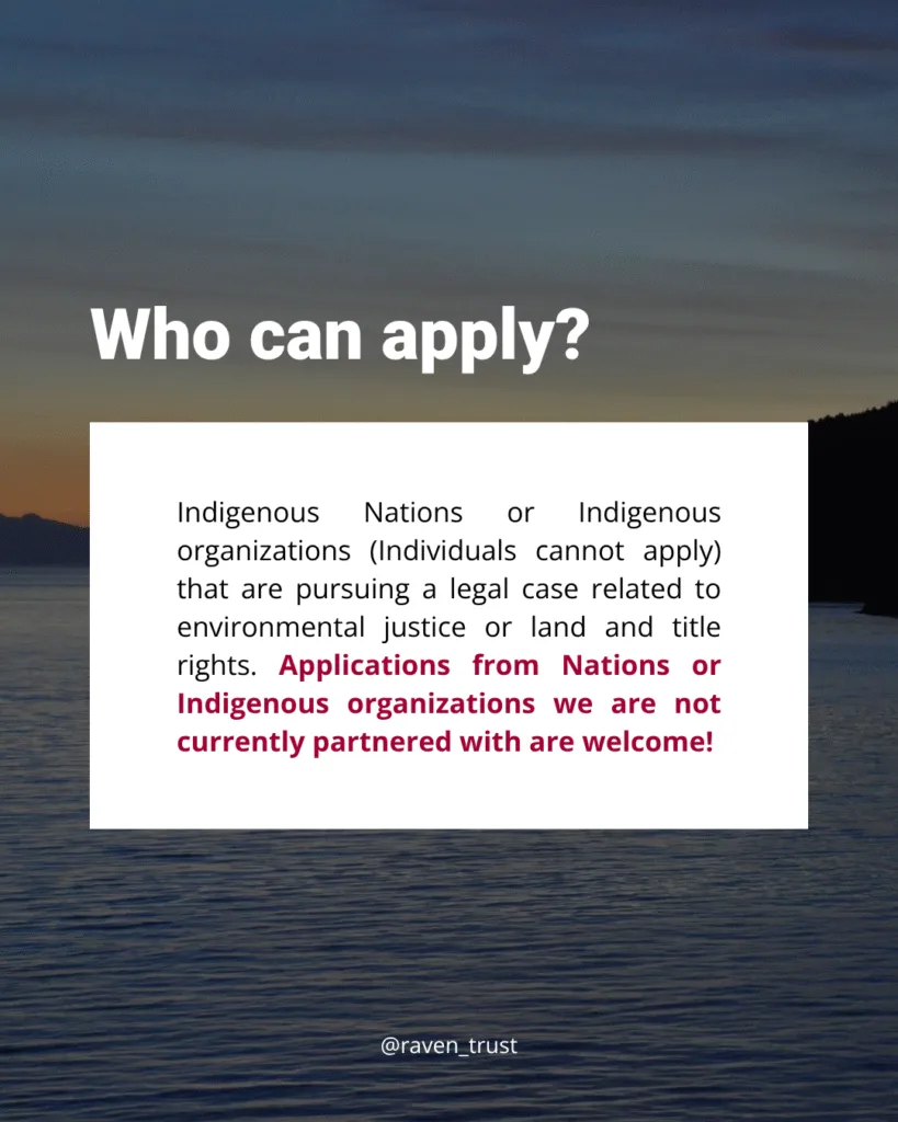 Indigenous Nations or Indigenous organizations (Individuals cannot apply) that are pursuing a legal case related to environmental justice or land and title rights. Applications from Nations or Indigenous organizations we are not currently partnered with are welcome!