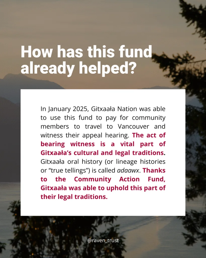 In January 2025, Gitxaała Nation was able to utilize this fund to pay for community members to travel to Vancouver and witness their appeal hearing. The act of bearing witness is a vital part of Gitxaała’s cultural and legal traditions. Gitxaała oral history (or lineage histories or “true tellings”) is called adaawx. Thanks to the Community Action Fund, Gitxaała was able to uphold this part of their legal traditions.