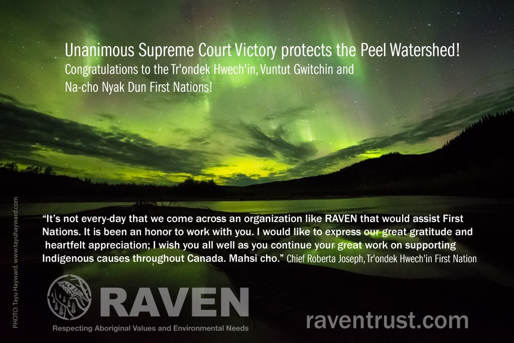 This victory would not have been possible without the bold actions and sustained support of the Canadian Parks and Wilderness Society, and the Yukon Conservation Society, through the whole trial and appeals process. Both environmental groups were appellants in their own rights, and were hugely instrumental in raising funds for the Yukon First Nations’ legal defence – thank you!