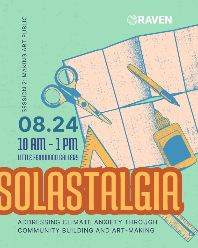 Join RAVEN for session 2 of our summer series addressing climate grief through community and art making. In this session, our collective ideas will be transformed into vibrant public art. We’ll be taking the insights and inspiration from our zine-making workshop and bringing them to life through a collaborative piece of art that we will bring to the public.
